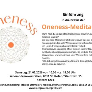 Zweiwöchentlich am Mittwoch gemeinsame Oneness Meditation per Zoom Online Meeting für alle die bereits den Einführungskurs haben. Wechselnde Oneness Mentoren führen durch die Meditation und beantworten alle deine Fragen zum Thema. 22. Oktober: Oneness-Meditation mit Krishna 05. November: Onenness-Meditation mit Aktu 19. November: Onenness-Meditation mit Aktu 03. Dezember: Onenness-Meditation mit Ajan 17. Dezember: Onenness-Meditation mit […]
